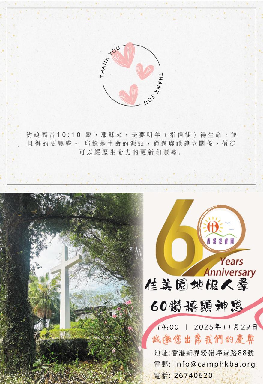 值此香港浸會園成立六十週年之際,我們滿懷感恩的心情,回顧過去六十年來的辛勤耕耘與不懈努力。